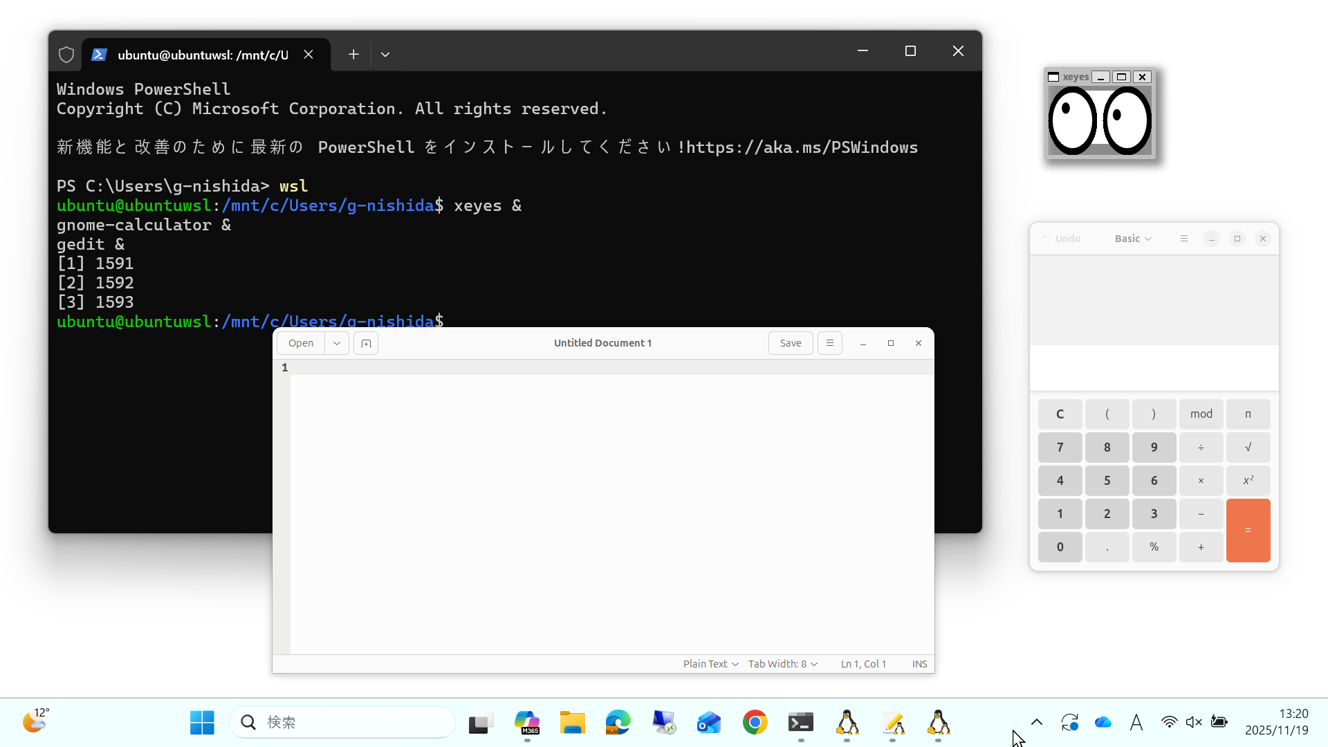 すると、xeyes(目玉)、電卓、テキストエディタ がそれぞれWindowsデスクトップ上にウィンドウとして表示されます。