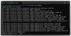ここではUbuntuでの作業です。前項の続きでの作業をする場合はそのままです。あらためてUbuntuを起動する場合は、Windows11上で管理者のターミナルを起動してからwslと入力してwslを起動します。(現状、wslでは緑色と青のプロンプトです。)