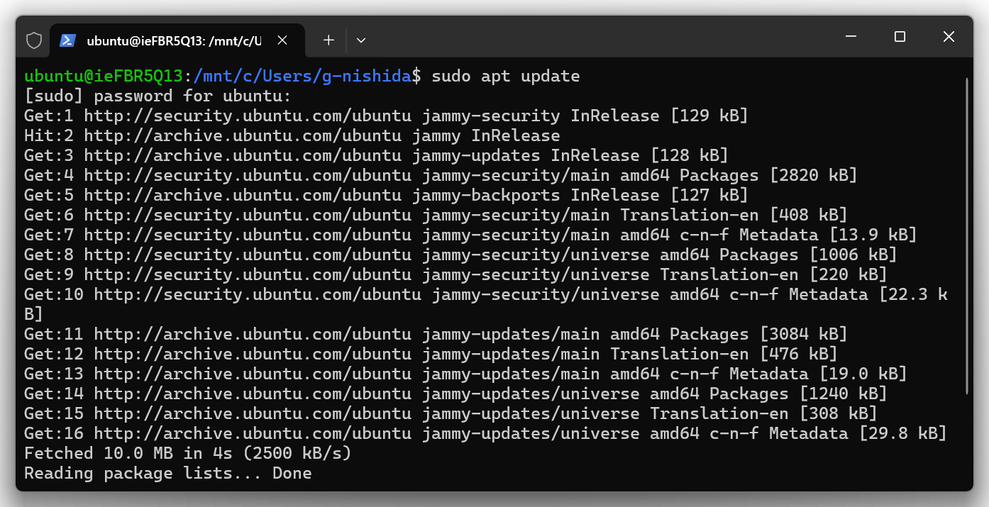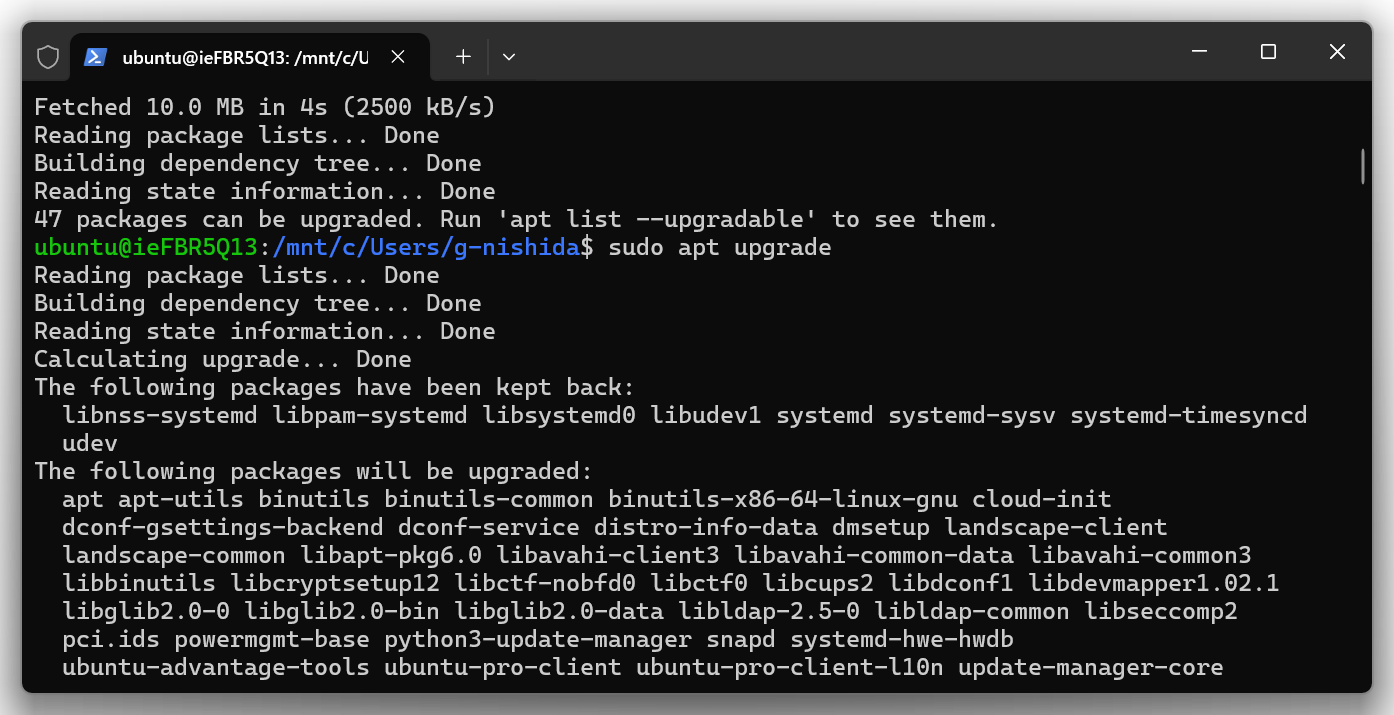 wsl上で以下のようにUbuntuのアップデートを行います。