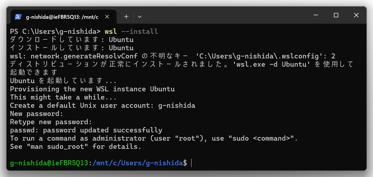 起動出来たターミナルからWSL2 をインストールします。以下を実行します。