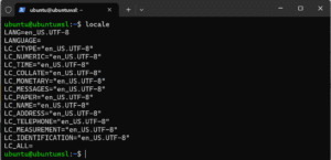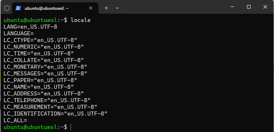 sudo apt install locales sudo locale-gen en_US en_US.UTF-8 sudo update-locale LC_ALL=en_US.UTF-8 LANG=en_US.UTF-8 export LANG=en_US.UTF-8