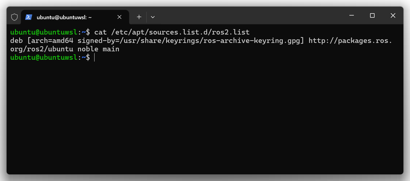 echo "deb [arch=$(dpkg --print-architecture) \ signed-by=/usr/share/keyrings/ros-archive-keyring.gpg] \ http://packages.ros.org/ros2/ubuntu noble main" | \ sudo tee /etc/apt/sources.list.d/ros2.list > /dev/null