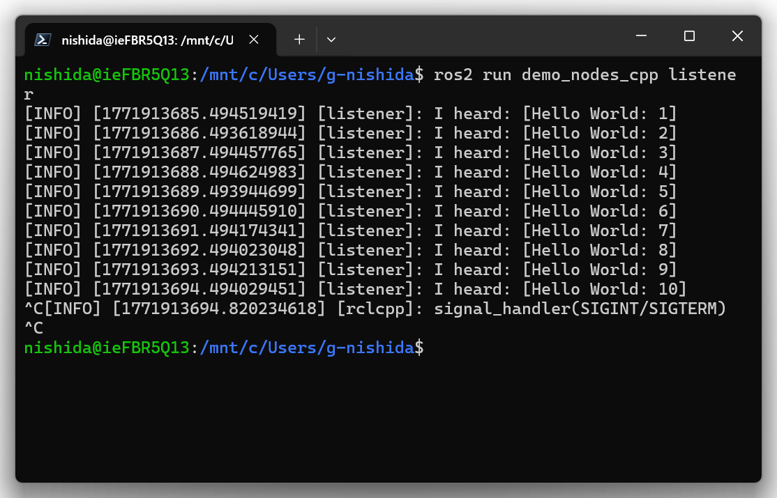 以下のようにlistener側にメッセージが表示されればDDS通信は正常です。ctrl+cで止めました。